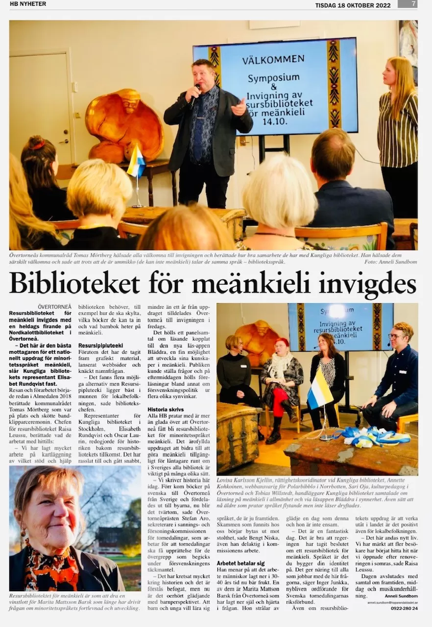 "Ett stort steg i meänkielis historia". Så sammanfattade kommunalrådet Tomas Mörtberg känslan när resursbiblioteket för meänkieli invigdes på Nordkalottbiblioteket i Övertorneå 14 oktober.